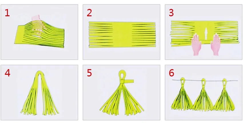 Шаг 5. Произведенные таким образом кисточки развешиваются на шнуре, который продевается в петли. Количество элементов выбирается по желанию. Чтобы кисти распределялись на шнуре равномерно, можно их также закрепить на нем при помощи клея.