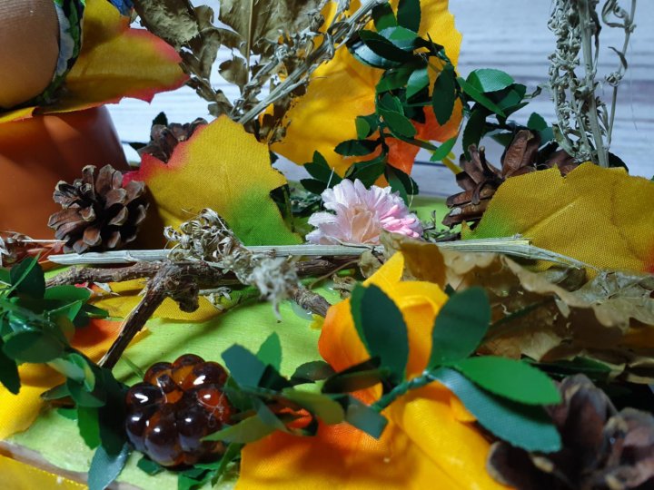 Оформляем его лицо, особо фиксируя внимание на добрых чертах и выразительных глазах (рис. 14). И Колобок из подручных материалов готов украсить любой участок. Бечевка может быть любого цвета, но более реальным будет желтый оттенок, ведь создание из теста бывает именно такое.