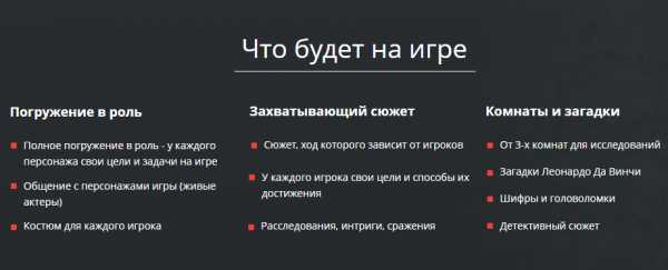 Этот безумный мирТип: ролевой квест Стоимость с команды: от 3900 р. Подробнее об игре>> | Убийство в монастыреТип: ролевой квест Стоимость с команды: от 3900 р. Подробнее об игре>> | ОстровТип: стратегия Стоимость с команды: от 3900 р. Подробнее об игре>> | Наследник ИмперииТип: квест-вечеринка Стоимость с команды: от 3900 р. Подробнее об игре>> |