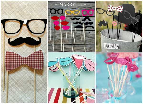 Последние несколько лет для фотосессий активно используется интересная бутафория и другие аксессуары на палочках: губы, усы, очки, шляпки и короны. Чтобы кадры получились оригинальными, нужно продумать собственный стиль аксессуаров под тематику вечеринки.