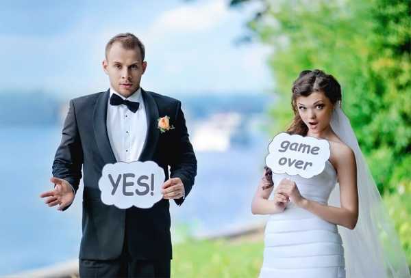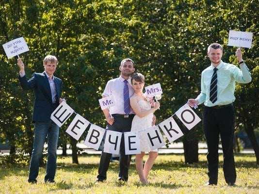 Гостям пригодится свадебная бутафория с шутливым текстом. Друзья могут окружить жениха и невесту в произвольном порядке или встать в ряд. Довольно оригинально выглядит реквизит в виде гирлянды. Язык может быть любым, большой популярностью пользуются надписи на английском языке.