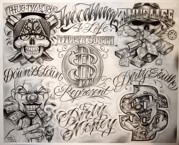 Одно из ответвлений стиля – «гангстерские» мотивы: игральные карты, оружие, наркотики, купюры.