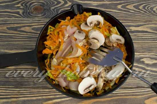 В сковороде нагреваем 1.5 столовые ложки рафинированного растительного масла без запаха. Обжариваем сначала лук, затем добавляем морковь и сельдерей. Через 5 минут кладём куриное филе, жарим 3-4 минут, затем добавляем грибы.