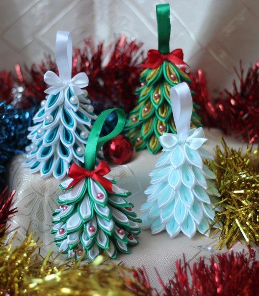 Новогодняя елка из атласных лент будет выглядеть еще нарядней, если ее украсить бисером, пуговицами, небольшими подвесками. В качестве украшения можно использовать декоративные булавки, брошки, бусы.