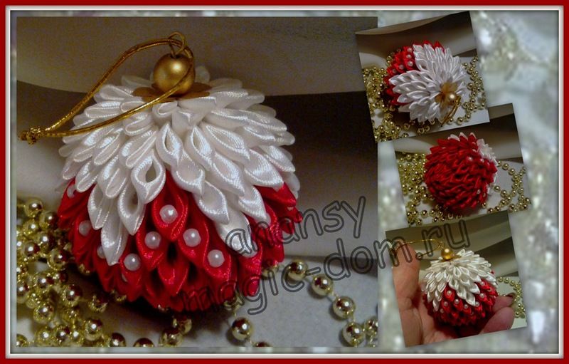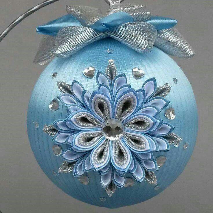 С помощью атласных ленточек можно изготовить оригинальные елочные шары. Достаточно лишь обклеить их цветами, лепестками из атласных лент, обтянуть атласом, украсить декоративными элементами.