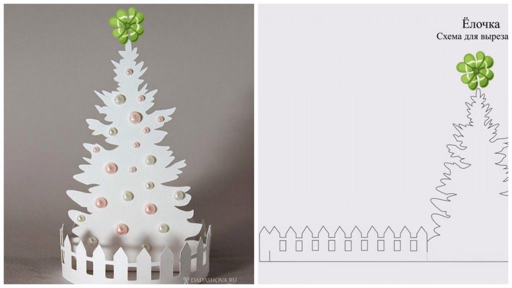 Красиво и оригинально смотрятся открытки, у которых ёлка находится не снаружи, а внутри.