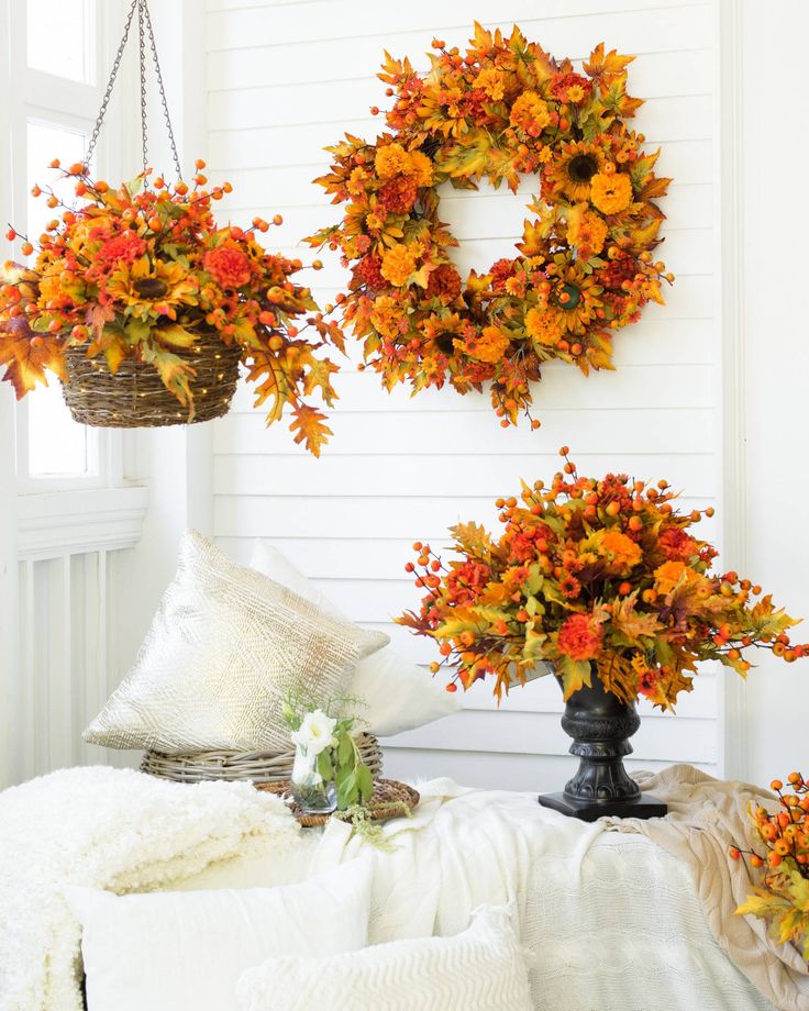 В этом интерьере осенний декор не так бросается в глаза, но лишь потому, что скромно и гармонично вписан в дизайн.