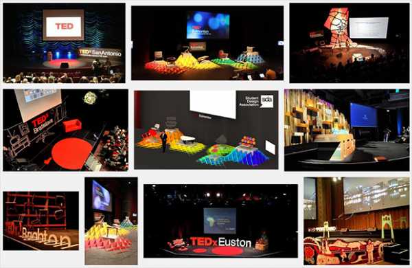 Очень много примеров всяких разных оформлений сцены есть просто в Google по запросу «TEDx scene design» — https://goo.gl/NFaiy6. Конференции TEDx проводятся по всему миру, и организаторы обычно уделяют дизайну сцены особое внимание, так как наиболее популярный «продукт» таких конференций — это видео-ролики с выступлениями спикеров, которые выкладываются в общем доступе и способствуют миссии TED — «делиться идеями, достойными распространения».