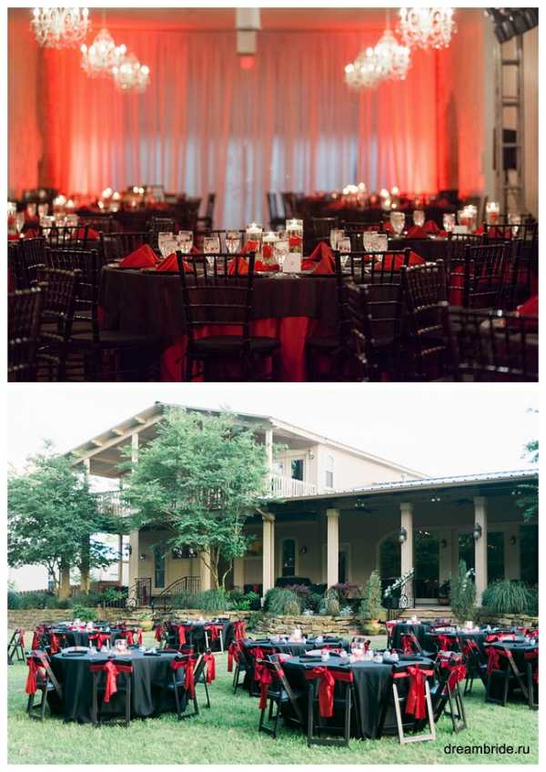 - Красно-белое торжество. Нежные нотки, дополненные цветом страсти, сделают мероприятие ярким, а фото – стильными и красивыми;