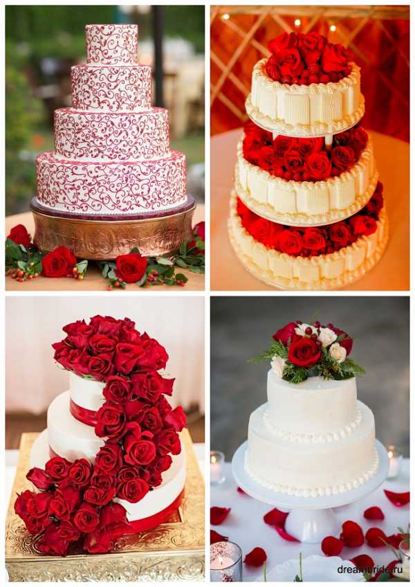 Гвоздём программы выступит красный свадебный торт. Для свадьбы в красном цвете неплохо подойдет торт с красно-белой глазурью и алым декором.