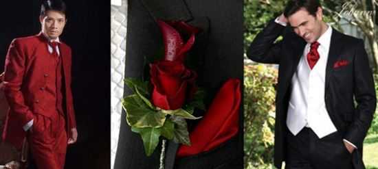 Жених: Жениху облачаться в красный костюм вовсе не обязательно. Тем более, что не все мужчины пойдут на такой смелый шаг. Наденьте наряд нейтральных тонов (черный, серый, белый), а бутоньерку, галстук, бабочку подберите красного цвета.