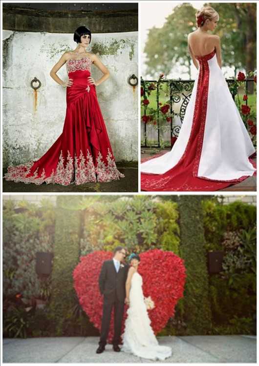 Если же невеста относится к миловидно-кукольным блондинкам или просто решила остаться в традиционном белом платье — можно акцентировать красный цвет с помощью аксессуаров: обуви, пояса, перчаток, диадемы, колье или украшения для волос.