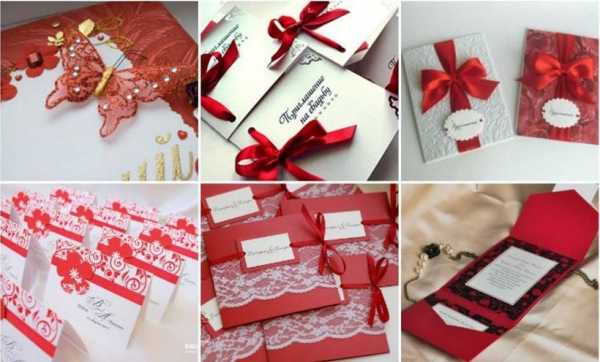 Для пригласительных открыток великолепно сочетание алого с золотым цветом. Неплохо смотрится красно-белая цветовая гамма с золотыми или черными вензелями. Дополните приглашения декором — стразами, бусинами, перьями или брошью.