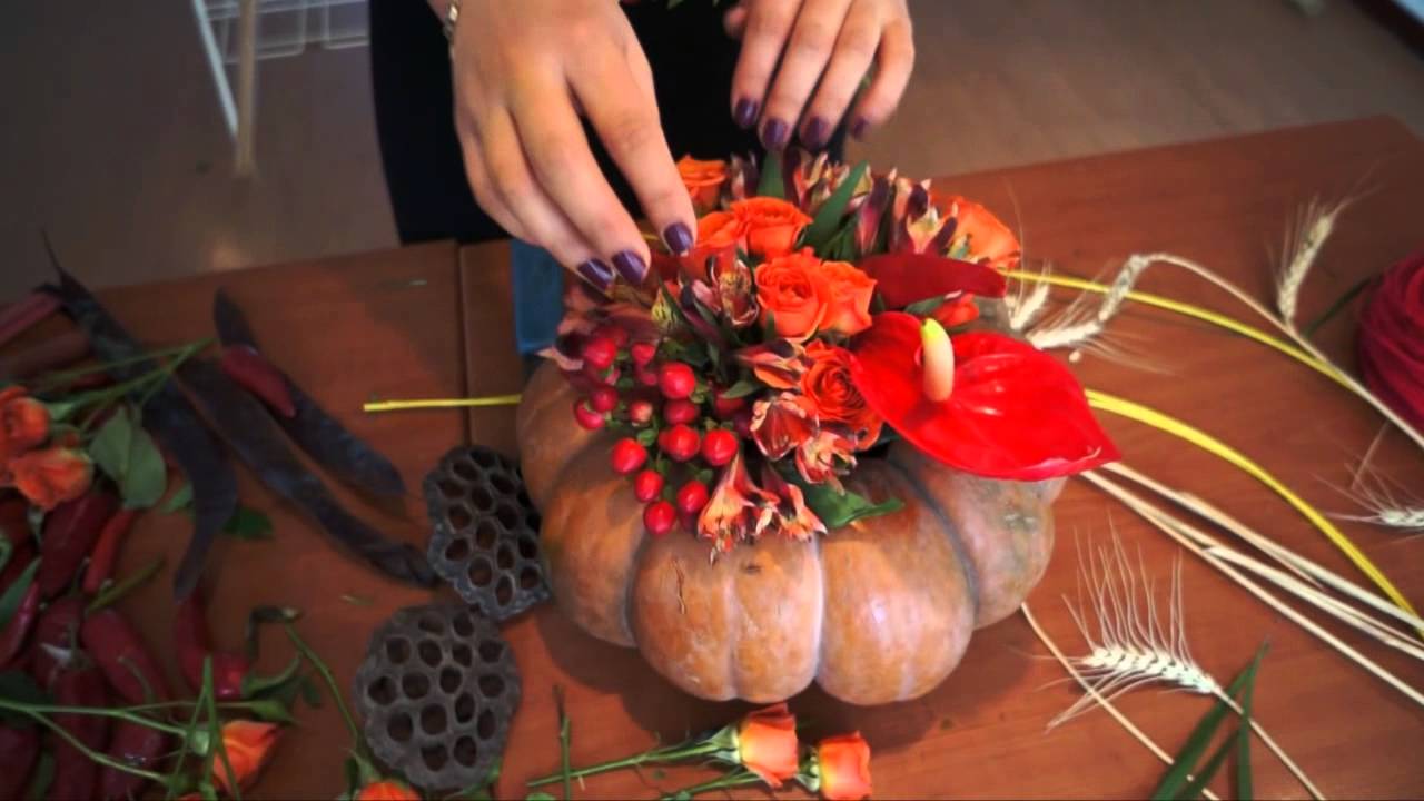 Отличный вариант осенней поделки – букет в вазе из тыквы. Такую композицию можно отнести на выставку, посвященную дарам осени, или подарить близкому человеку. Мастер-класс по ее изготовлению выглядит следующим образом.