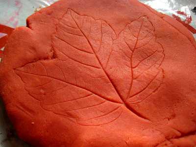Выше мы рассказывали о том, как можно оставлять отпечатки листьев на бумаге. См. пункт №9. Еще интересней делать отпечатки листьев на е. Для этого раскатайте скалкой, сверху приложите листик выступающими прожилками вниз, пришлепните его слегка, а теперь еще раз прокатайте скалкой с некоторым нажимом. Аккуратно снимите листочек.