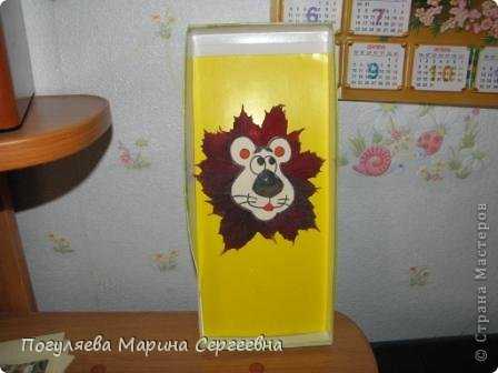 Чтобы сделать льва своими руками, как на фото, пригодятся несколько кленовых листьев или любых других, только гораздо больше. Еще нужна основа, клей, ножницы и мордочка будущего царя зверей. Из заготовок делаем пышную гриву и приклеиваем сверху лицо. Такую аппликацию можно повесить на стену, или украсить банку с карандашами.