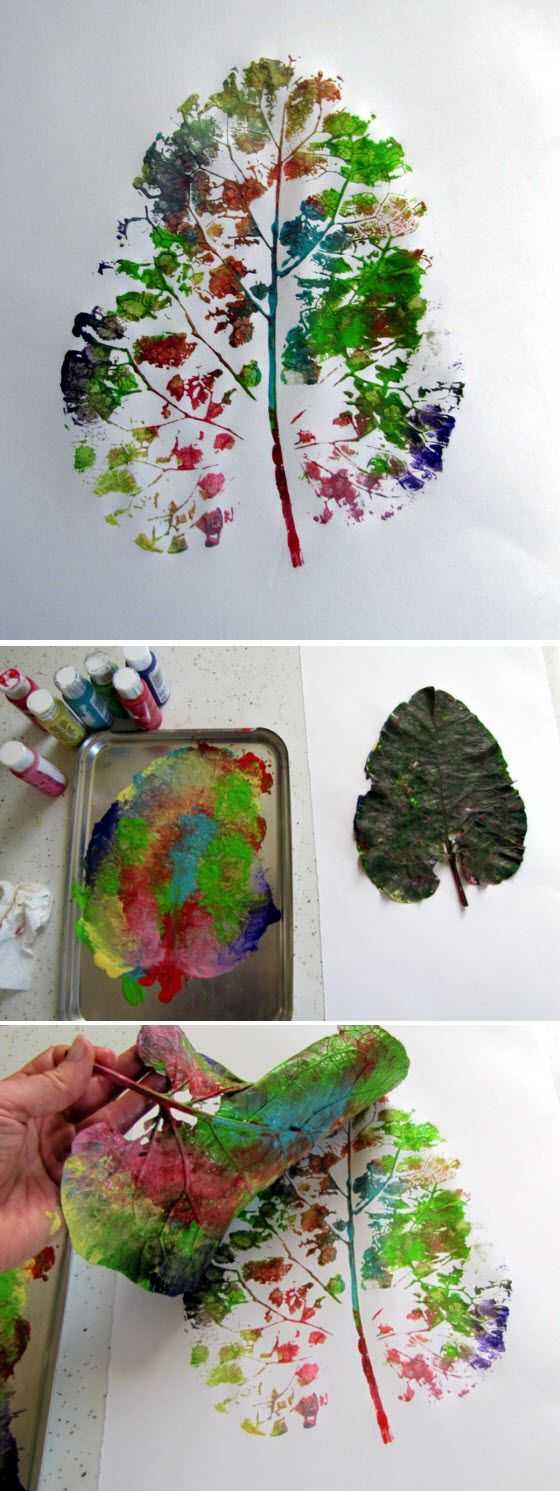 Если ваш ребенок еще не знает, что можно получать красивый отпечаток, прикладывая раскрашенный осенний лист к белому или крафтовому листу бумаги, то самое время показать ему этот «фокус».
