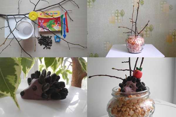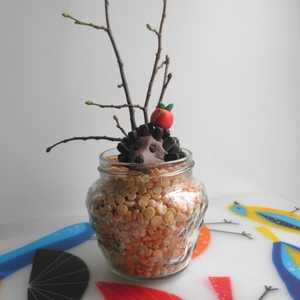 Такая поделка предполагает множество вариаций в зависимости от того, какие материалы Вы смогли отыскать дома и на улице. Стеклянную банку можно заменить стаканчиком из-под йогурта; горох — любой другой крупой, макаронами, камешками, речным песком; иголки можно сделать из лапши, арбузных косточек или др. семян; вместо пластилинового яблока можно использовать плоды боярышника или шиповника.