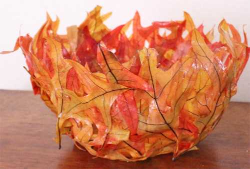 Базовым элементом поделки здесь выступает пластиковая или бумажная одноразовая тарелка с вырезанным дном, на которую с помощью клеевого пистолета или другого подходящего клея в тюбике, приклеиваются разноцветные осенние листья.