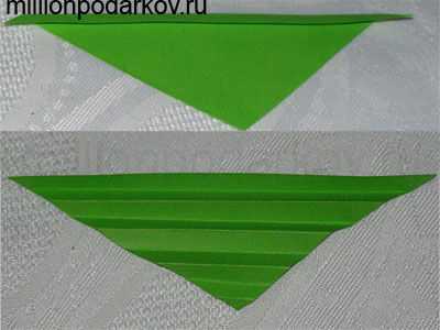 Складываем треугольникДля того чтоб сделать нашу осеннюю поделку из бумаги нам потребуется нарезать треугольников из желтой, оранжевой и зеленой бумаги. Теперь нужно сделать листочки с наших треугольничков. Складываем треугольники начиная с верху по принципу «гармошки», как показано на фото.