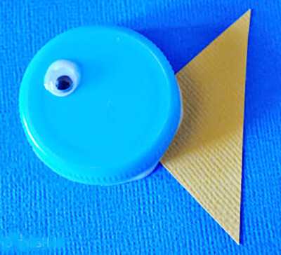 Приклеиваем хвостик и крышечку на голубой фон. Остается добавить игрушечный глазик – и рыбка готова.