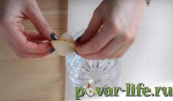 Перегнуть печенье через край стакана и в этой форме дать остыть. Можно положить в тот же стакан или в форму для выпечки кексов, чтобы печенье не развернулось.