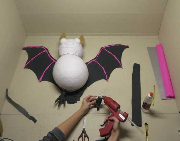 крылья к спинке приклеиваем тоже на горячий клей, держим крепко до полной фиксации