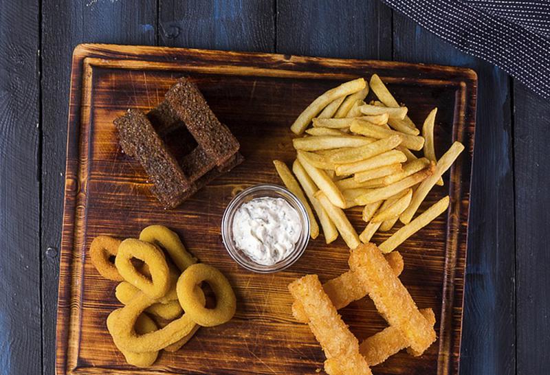 Куриные крылышки, колбаски австрийские, наггетсы, фри, луковые кольца, гренки чесночные, томатный соус
