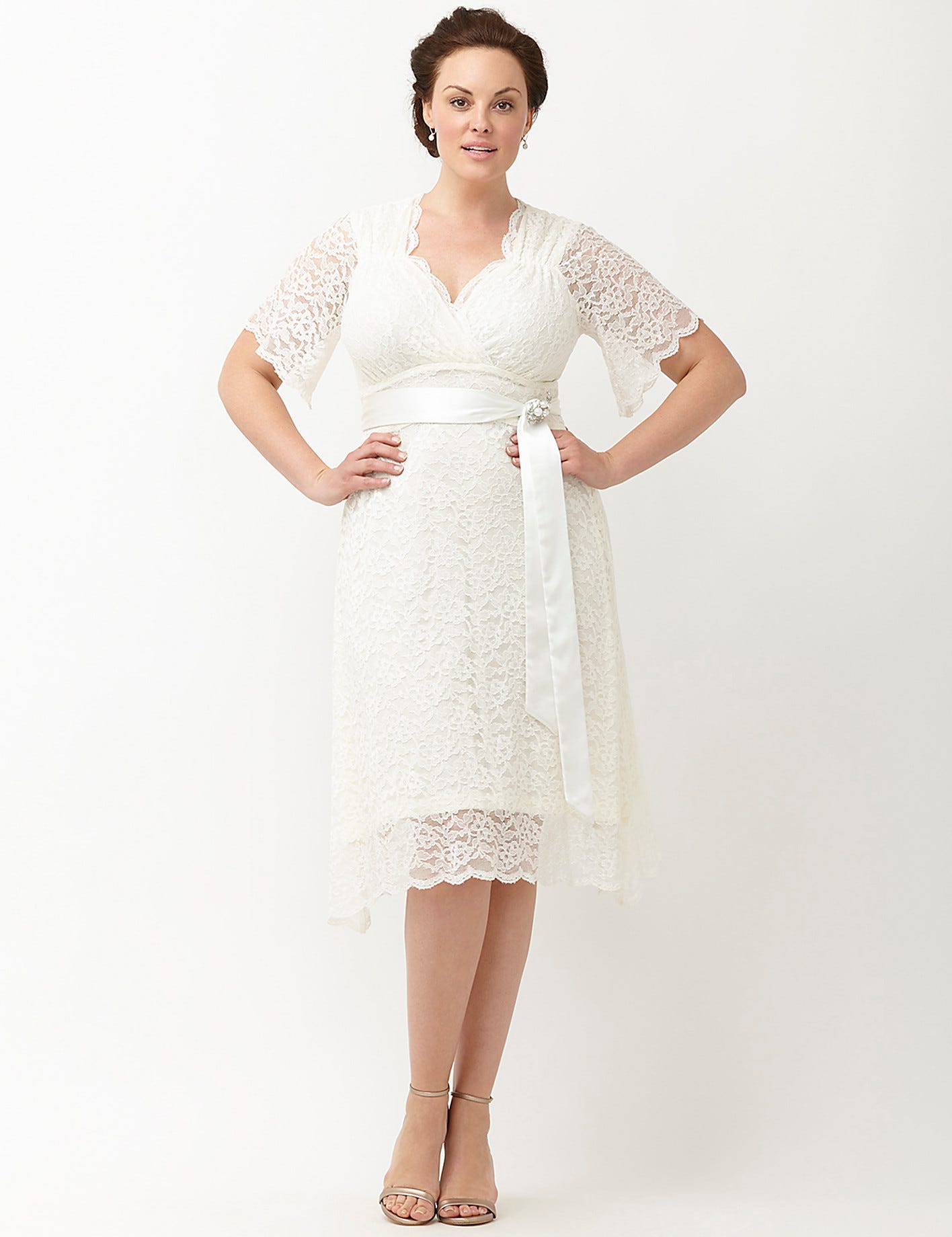 Также, для того чтобы скрыть широкую талию подойдут короткие свадебные платья для полненьких. Короткие – это вовсе не длина мини, которая не очень подходит таким девушкам. Свадебное платье-футляр длиной до или ниже колена отлично сидит на полненьких, стройнит и скрывает складки на животике.