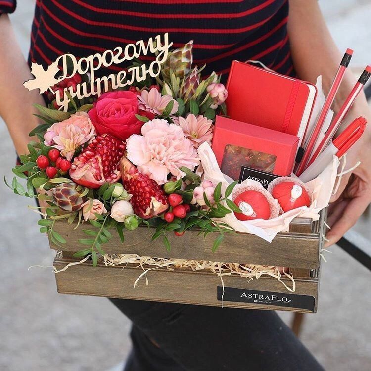 Почти не займет времени создание необычного букета из ромашек с вклеенными туда снимками учеников и преподавателя. Еще один недорогой вариант — букет или корзинка из конфет, карандашей и других канцелярских принадлежностей.