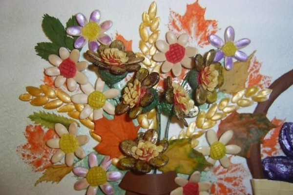 Более сложными в исполнении считаются объемные поделки, конечно, смотрятся они куда эффектней, к тому же такие шедевры прекрасно справляются с функцией комнатного декора. Например, из цветов, сделанных из тыквенных семечек можно собрать превосходные композиции в вазочках, оригинальные картины и панно. Делать «тыквенные» цветочки можно по-разному: можно склеивать семена между собой при помощи клеевого пистолета, можно приклеивать семечки на кружок из картона, надежным подспорьем в работе для самых маленьких и неопытных станет пластилин.