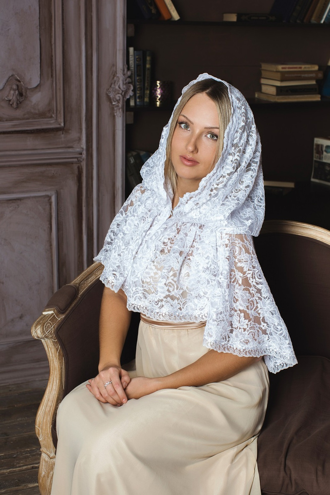 Более классический вариант – платок, который может закрывать как только волосы, так и представлять собой изящный плащ или болеро, укутывающий также плечи, руки, спину и декольте. Материал аксессуара допустим самый разнообразный – от кружева до невесомого фатина. Цвет необязательно белый, но непременно светлый и не слишком яркий.