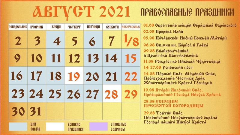 - 7–13 августа: Неделя упражнений с ребенком, Международная неделя собак-помощников, Национальная неделя фермерских рынков