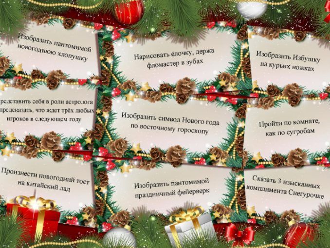 Новогодние предсказания шуточные от цыганки. Заранее приготовьте колоду карт, на одной стороне которых будет записано шуточное предсказание, а другую можно оставить без изменений, а можно нарисовать на ней забавный рисунок, соответствующий содержанию. Для начала раздайте гостям пустые карты и предложите им написать прикольные и добрые новогодние предсказания будущего. Затем карты собираются, один из присутствующих наряжается цыганкой и под веселую музыку гадает всем желающим. Каждое «пророчество» следует обязательно зачитывать вслух.