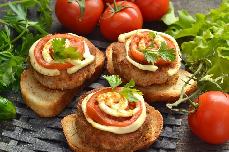 5. Выкладываем полученную массу на нарезанные кусочки батона, сверху кладем по кусочку помидора.