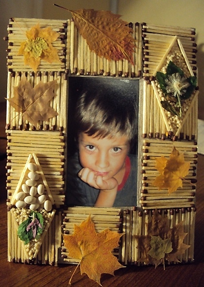 Когда листочки будут готовы, то просто обклейте ими основу для фоторамки из картона и вставьте в нее свое любимое фото на фоне осенних деревьев.