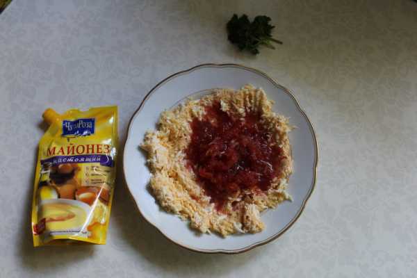 2. Добавляем натертый сыр, выдавливаем маленький зубчик чеснока, солим и заправляем начинку майонезом. Количество соуса на свое усмотрение, но много не добавляем.
