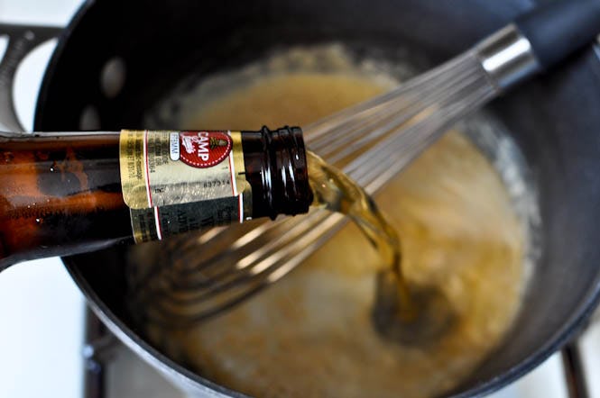5Влейте пиво, затем посолите и поперчите. Перемешать, накрыть крышкой и выпекать 1 час, периодически помешивая.