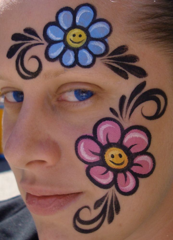 Цветочный узорыФантазийные узоры, цветочные мотивы и милые личика принцесс особенно популярны среди девочек. Например, узор с цветами или веточкой цветущего дерева украсит лицо юной принцессы на празднике.