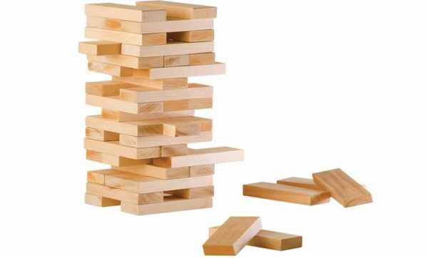 Ещё её называют «башня». Всё потому, что состоит она из деревянных брусков, которые выкладываются в строение, напоминающее башню. Задача игроков точными движениями вытаскивать из основания башни по бруску и выстраивать новый уровень. Проигрывает тот, у кого башенка рассыпается.
