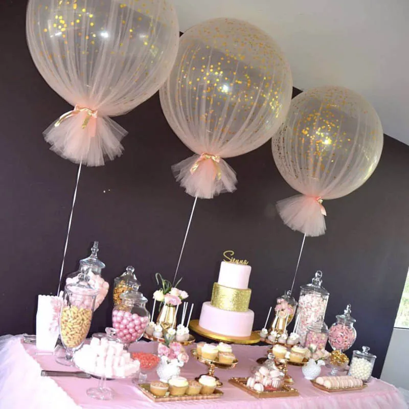 Обычные шары изготавливаются с помощью латексного материала – они самые дешевые и имеют, как правило, овальную форму. Лучше всего будет наполнить их гелием, чтобы они парили над землей. Такие шарики свяжите по несколько штук или отпустите к потолку – эта декорация зала будет выглядеть потрясающе.