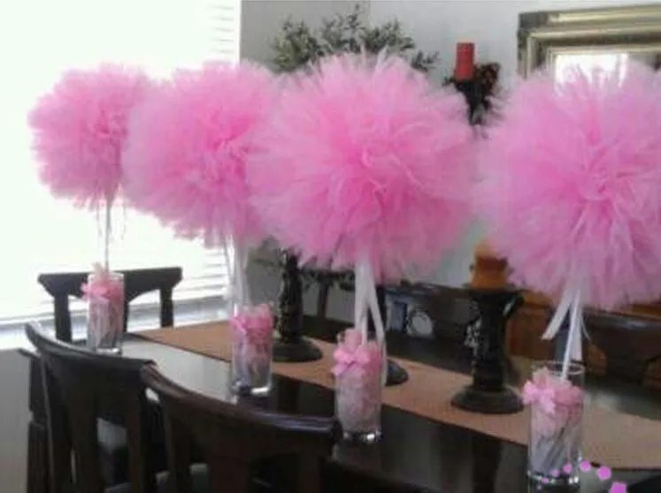 Вы можете сделать ОЧЕНЬ большие помпоны из тюля, плотно обернув ткань вокруг ширины книги, завязав посередине и обрезав. Это хорошо работает для больших свадеб, душа, вечеринок и домашних украшений, но не дает такой аккуратной отделки.