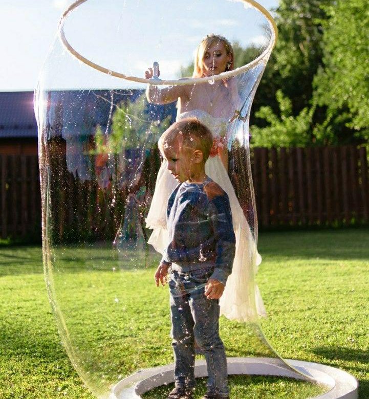 - Хула-хуп действовал как огромная палочка для пузырей, и ребенок действительно мог стоять ВНУТРИ пузыря, в то время как самые большие пузыри окутывали его!