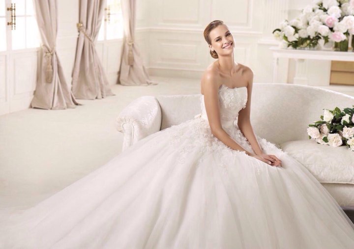 Бальное платье — это то, что вы представляете, когда думаете о свадебном платье принцессы: обтягивающий корсаж, вероятно, без бретелек, и пышная пышная юбка.