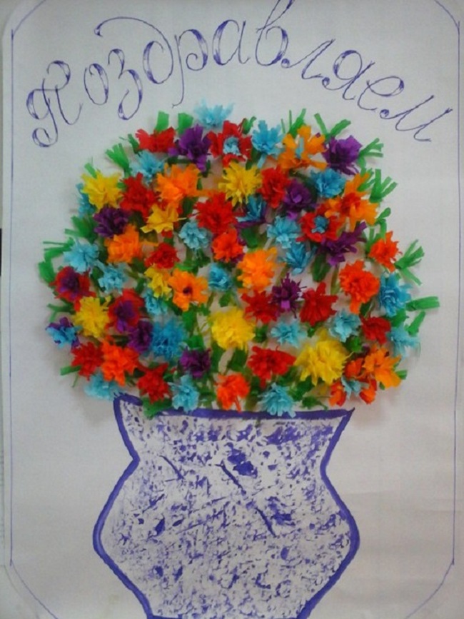 В качестве одного из вариантов для поздравления, можно предложить нарисовать работу при помощи восковых мелков и акварели.