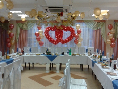 При оформлении зала воздушными шарами нужно быть очень внимательным в выборе цвета. Лучше всего ограничиться двумя благородными цветами, сочетающимися с цветом стен зала и другого декора. Использование разноцветных воздушных шаров может превратить свадебное торжество в детский утренник. Однако в некоторых случаях использование трех и больше контрастных цветов бывает уместно: это зависит от общей идеи декора.