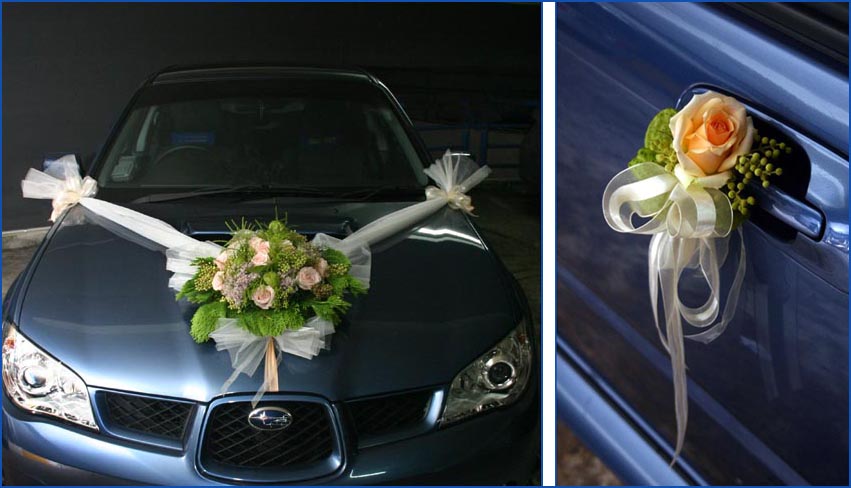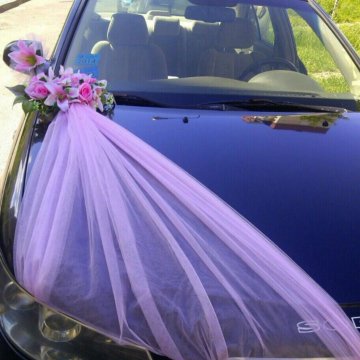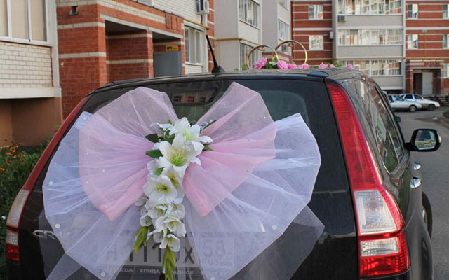 Здесь уместно разместить большой бант из жесткого фатина, в центральной части которого может находиться композиция из тех же цветов, что украшают капот авто.