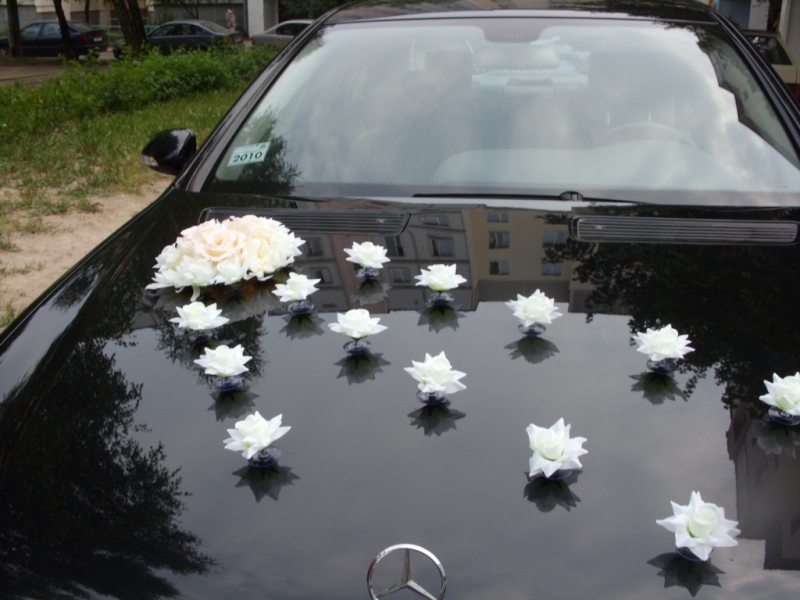 Самое главное в декорировании свадебного авто — чувство меры. Не обязательно украшать машину одновременно шарами, лентами, тканью, наклейками «Молодожены» и живыми цветами. Достаточно выбрать один-два элемента. Живые цветы обычно смотрятся очень красиво: можно украсить цветами капот, а ручки дверей — сочетающимися с ними маленькими букетами и лентами (с помощью лент веточки цветов будут крепиться к ручкам).