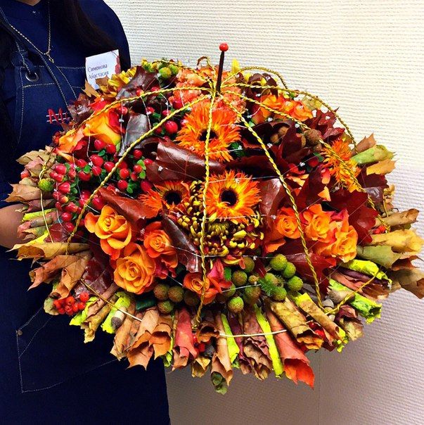 Зонт действительно выглядит как букет, если положить туда цветы! Это делает его идеальным для дверных венков или просто случайным подарком для кого-то особенного вместо простых цветочных букетов.