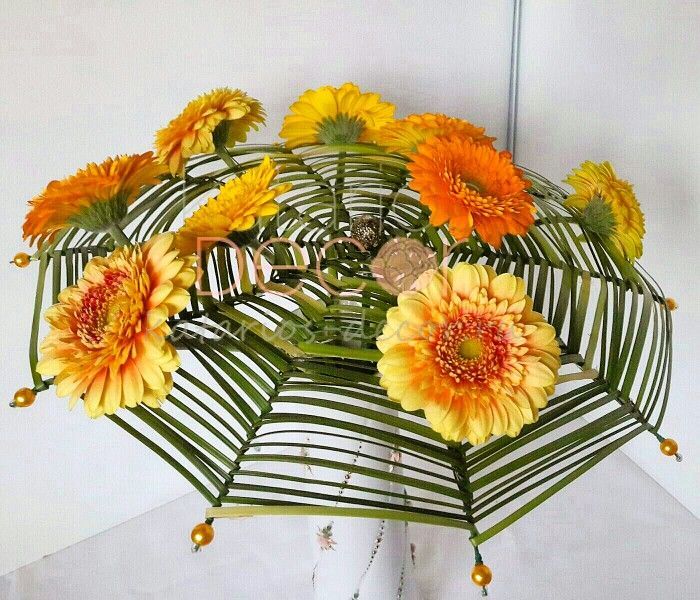 Из основания этого перевернутого зонтика выступают красивые цветы.